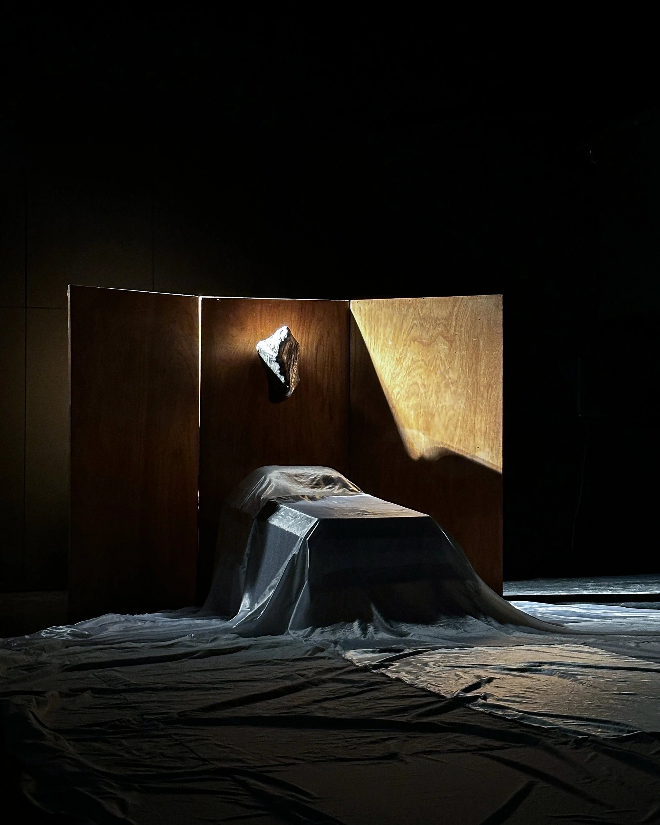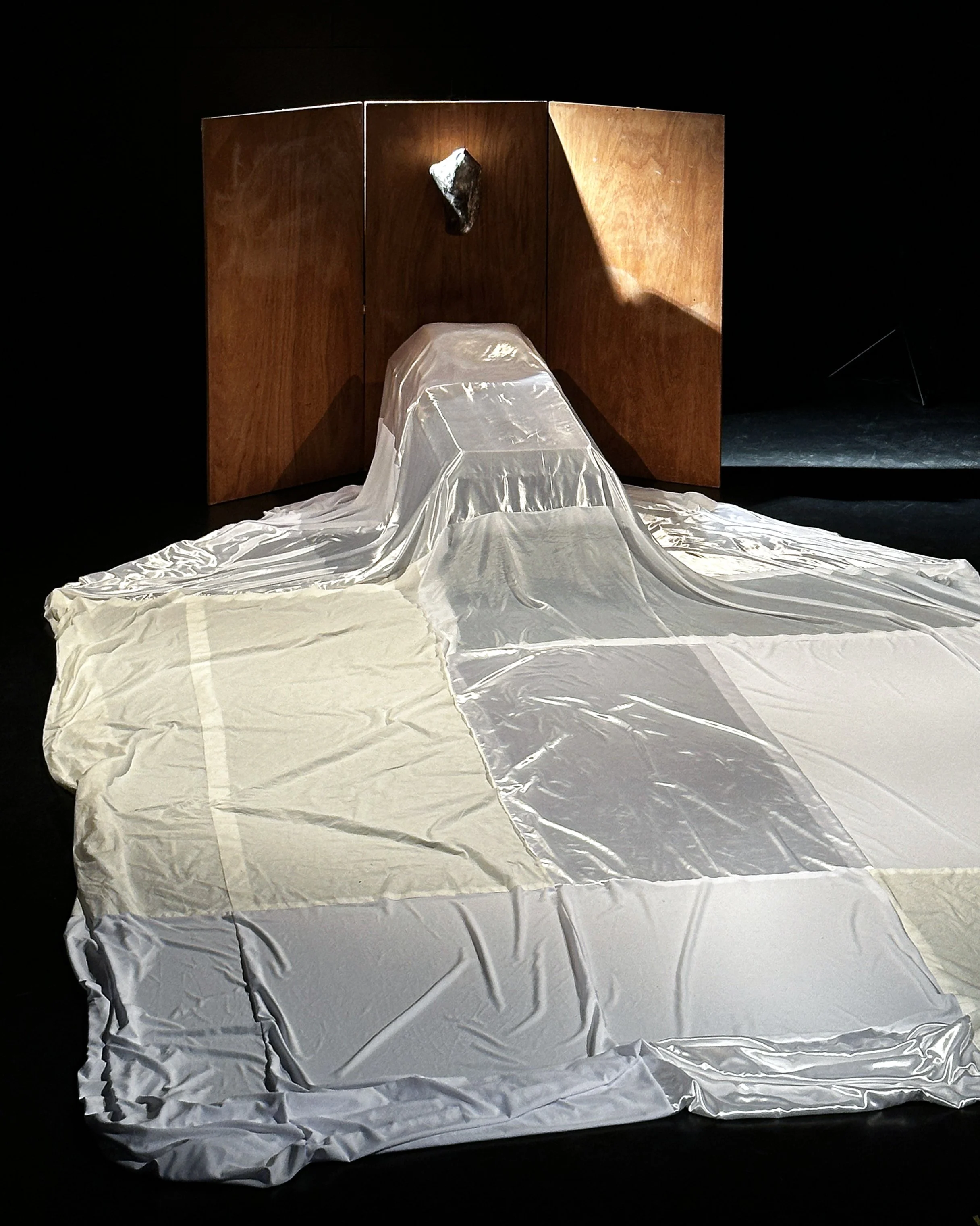 Création d’une scène, entre rêve et réalité, à cheval sur la mort, composée d’un drap rapiécé, symbole d’une vie passée, et d’un Veilleur, sculpture protectrice.